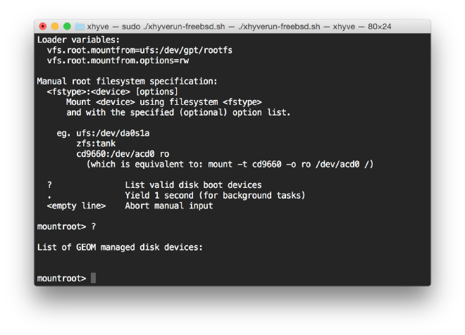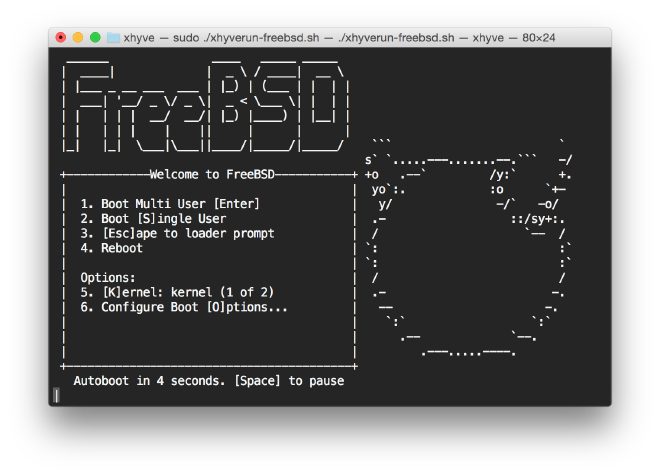 xhyve で FreeBSD をサポートさせるプルリクを見つけたので、xhyve で FreeBSD を動かしてみた。