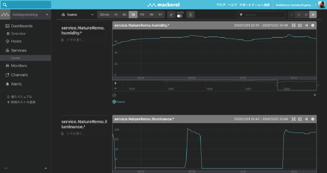 しばらくすると、サービスメトリックに Nature Remo が収集した温度や湿度が連携されるようになります。